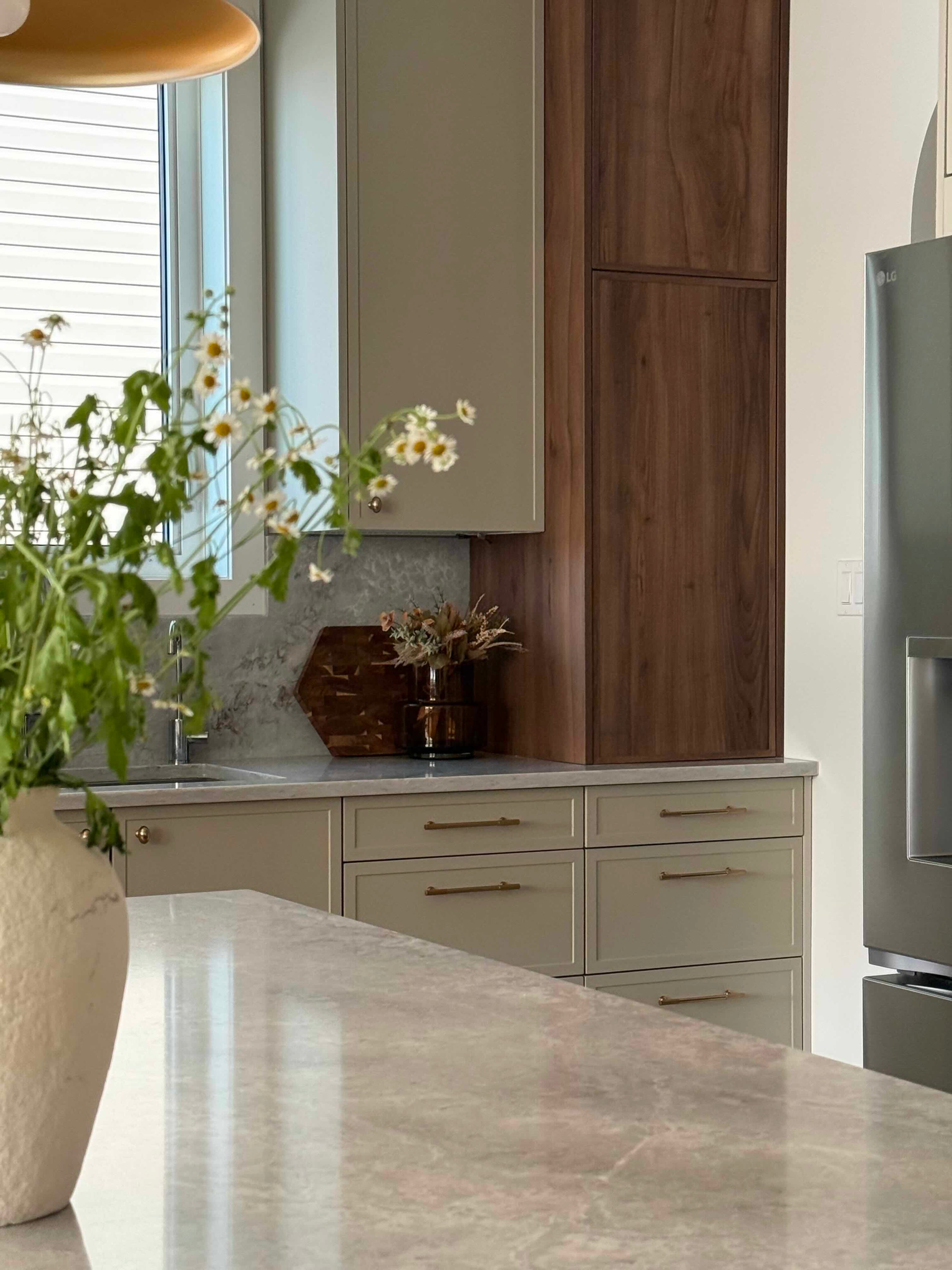 Western Living design winner, Jessica Bremner, @jessicabremnerdesign, paired Kitch Shaker Slim door fronts in Mist and Euro Slab in Fashionista.