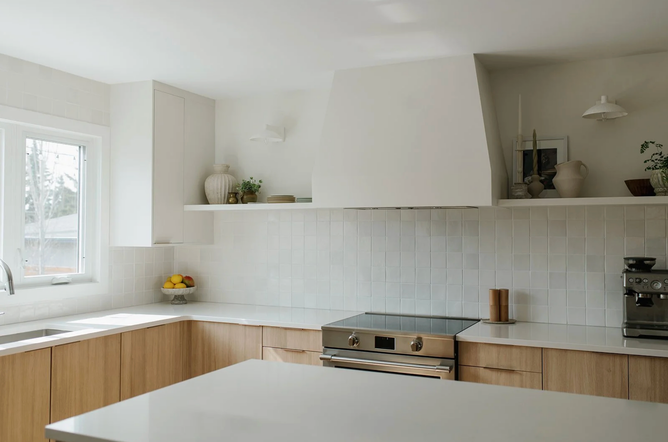 The Vike Kitchen x Kitch collaboration. This space features our Shaker Bevel cabinets in Stratus and our Floating Shelves in Fresh Linen.